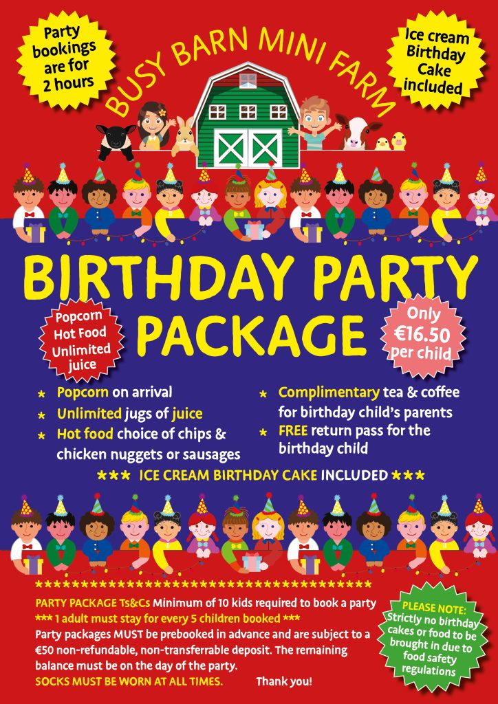 Party Package Booking T&C’s: Party packages MUST be prebooked in advance and are subject to a €50 non-refundable, non-transferrable deposit. The remaining balance must be paid on the day of the party.